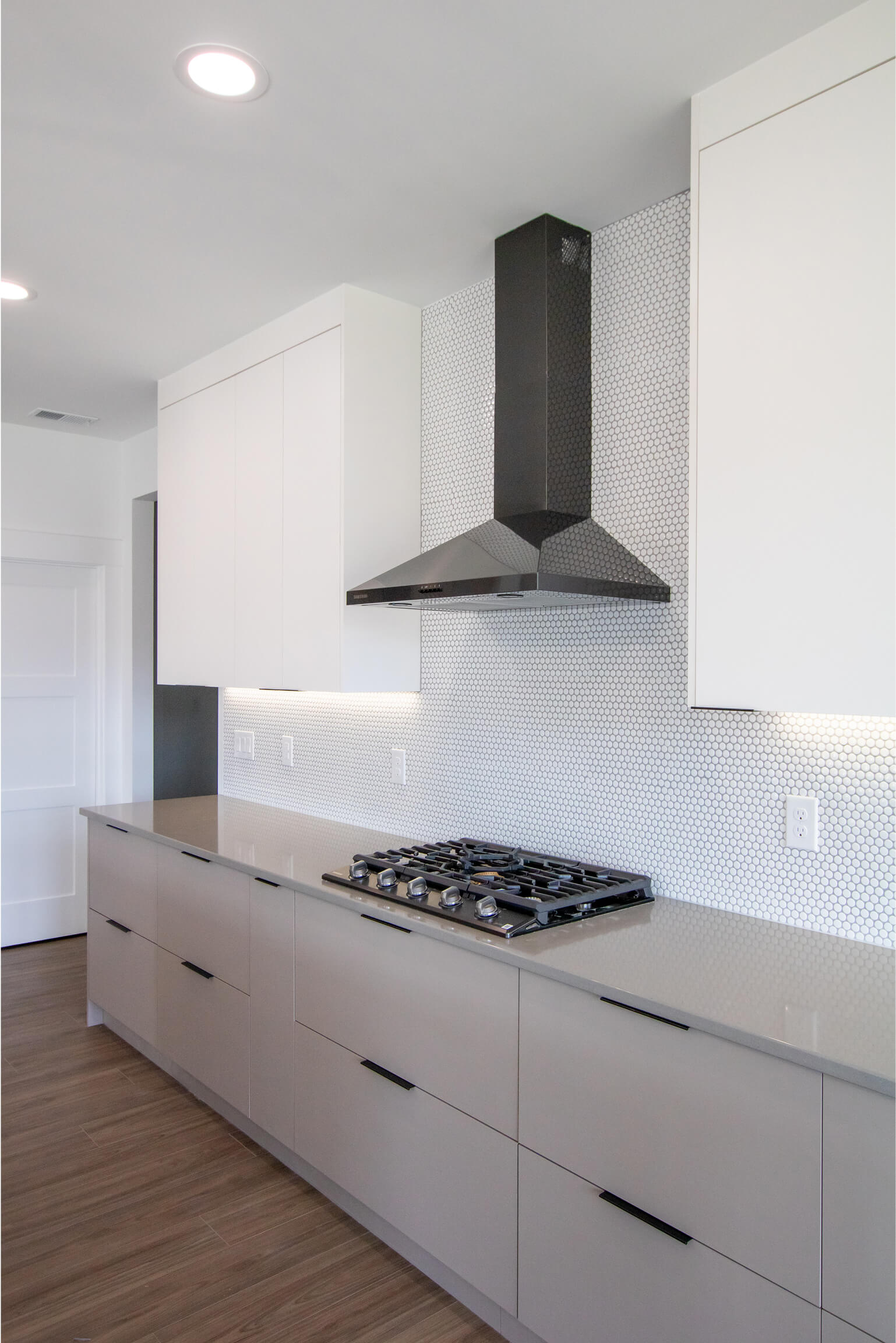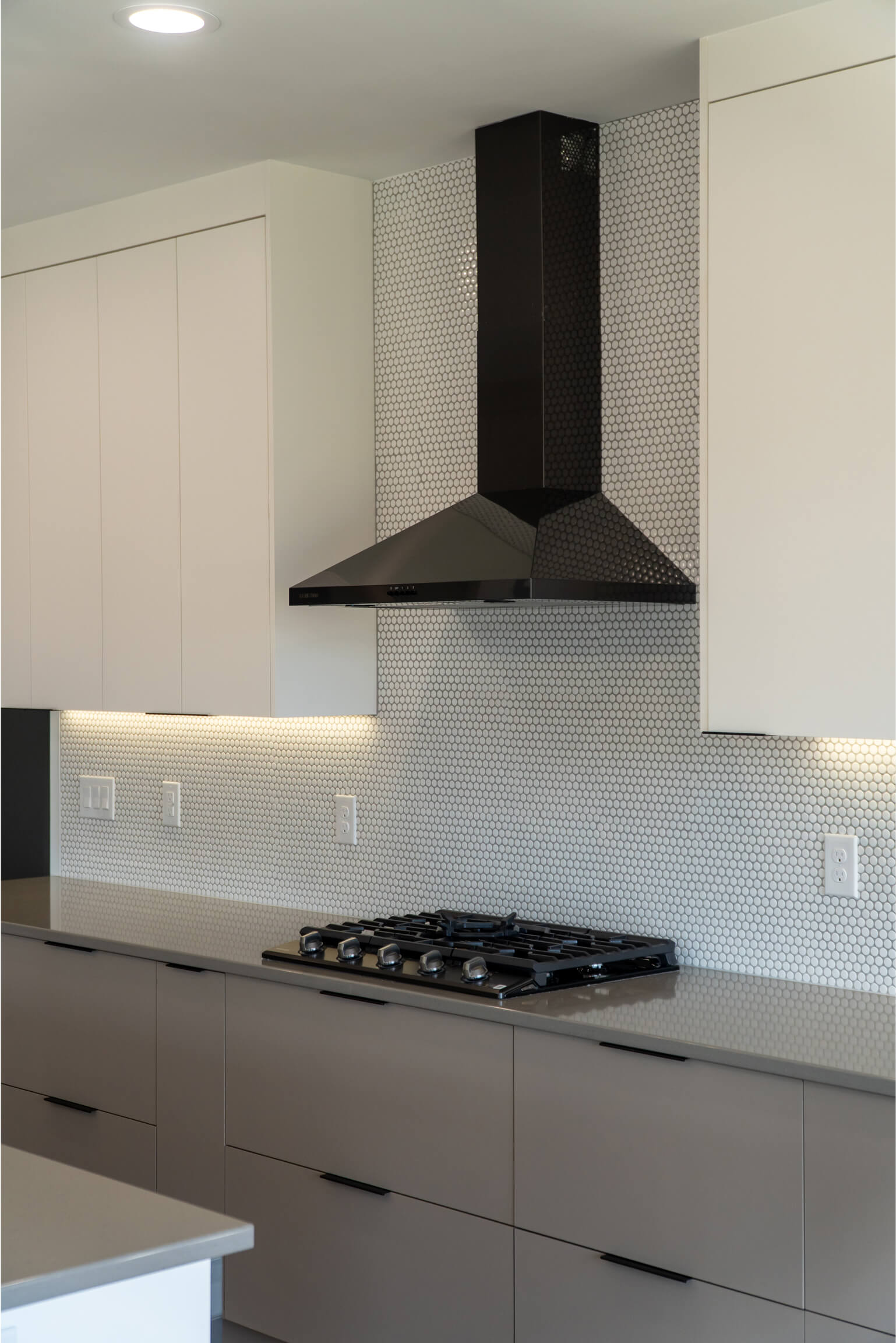 This kitchen combines clean lines with warm contrasts, featuring sleek cabinetry and a bold island centerpiece. The matte tones and geometric lighting add character, while the thoughtful layout ensures both comfort and efficiency. A refined design that feels equally modern and inviting.